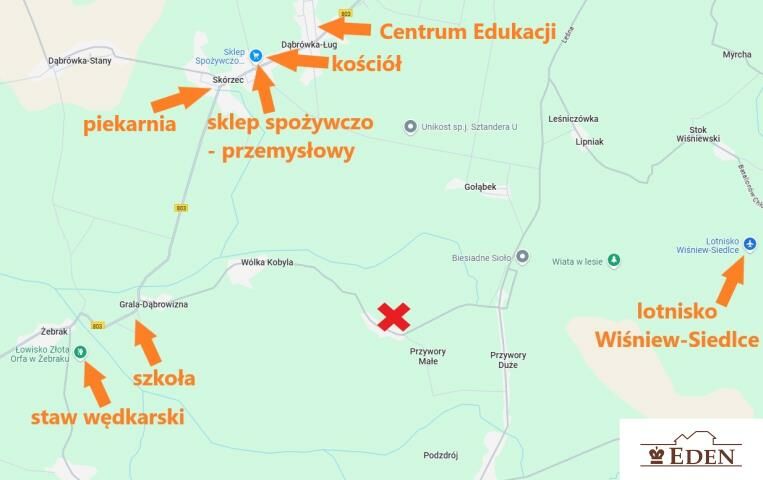 Dodatkowym atutem jest dogodne położenie względem pobliskich miejscowości jak: Skórzec 6 km, Siedlce ok. 15 km.